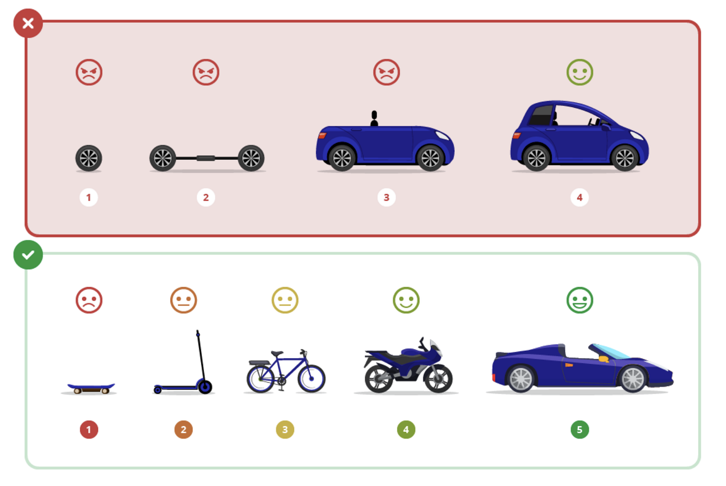 The image below perfectly captures the MVP philosophy: starting small, testing fast, and iterating towards a product that'll make your competitors cry into their overpriced lattes.