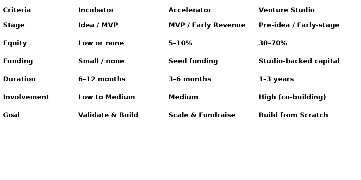 At this stage, everyone has advice. “Join this accelerator, pitch here, apply there.” You'll hear terms like incubators, accelerators, and venture studios tossed around casually — but the truth is, most founders don’t fully understand the difference. And choosing the wrong model early on can lead to mismatched expectations, wasted time, and even equity dilution.